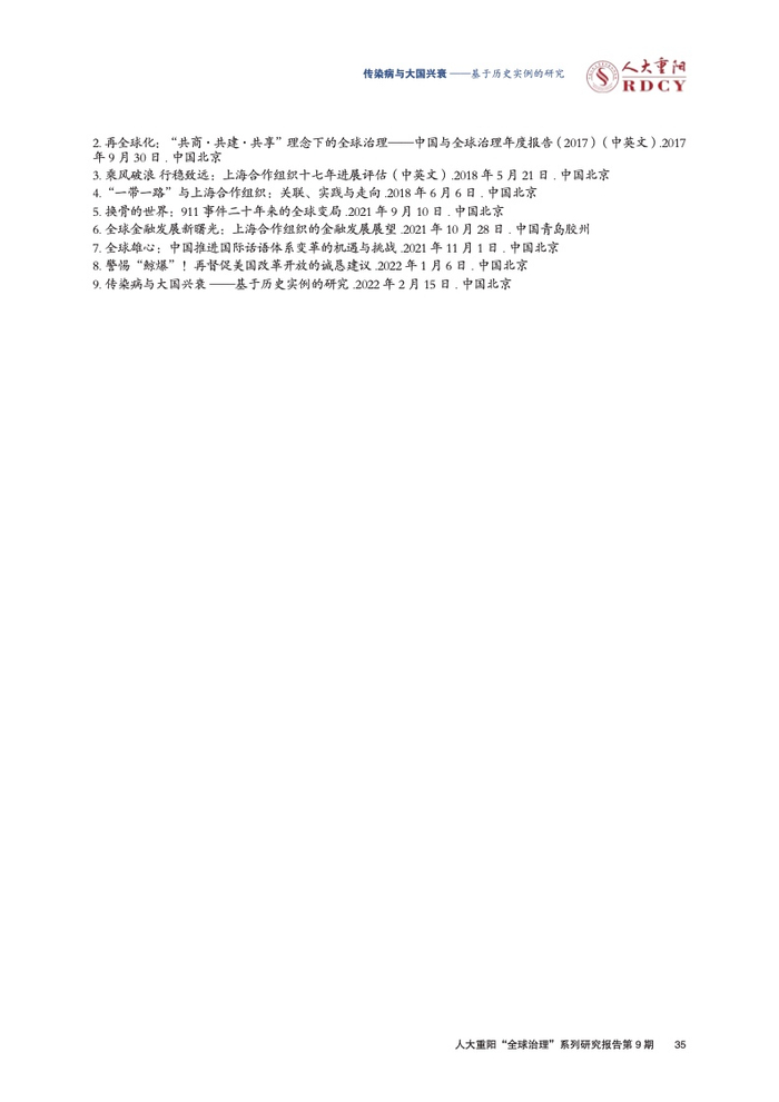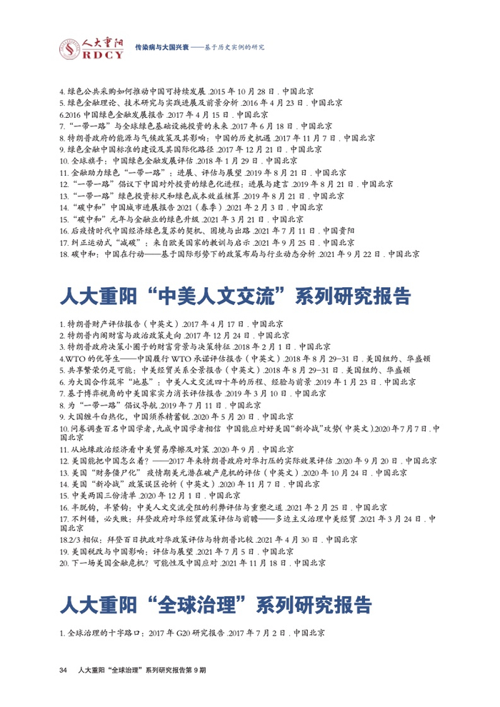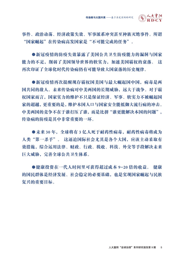 ●新冠疫情再次提醒现存霸权国美国与最大崛起国中国,病毒是两国共同的敌人。未来传染病对中美两国的长期威胁,远大于战争。对于霸权国家而言,国家实力的维护不只是保证经济、军事、软实力不被崛起国家的超越,更重要的是,维护本国人口与国家安全能抵御大流行病的冲击。中美两国的竞争不在于谁打压了谁,而是比拼“谁更能解决本国的问题”,传染病的防疫是其中非常重要的一环。