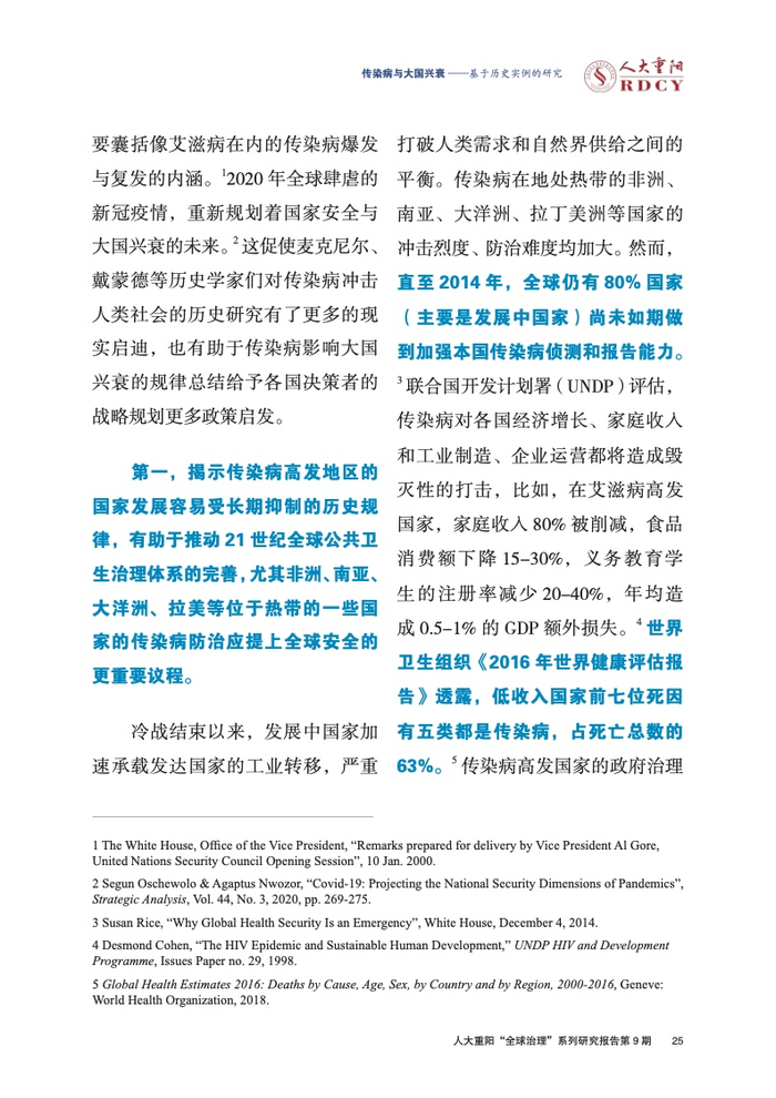 ●低收入国家前七位死因有五类都是传染病,占死亡总数的63%。传染病高发国家的政府治理能力被极大地削弱,还会引发频繁的社会暴力事件、政治动荡、经济政策失效、军事派系冲突甚至种族灭绝事件。所谓“国家崛起”在传染病高发国家是“不可能完成的任务”。