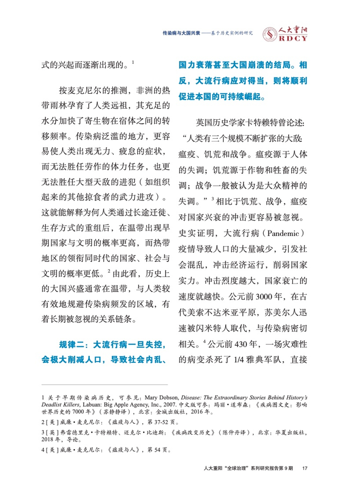 ●传染病与大国兴衰有三层历史规律假设。规律一:传染病在热带易爆发的自然特征,抑制了大国在传染病易发区域的成长。规律二:大流行病一旦失控,会极大削减人口,导致社会内乱、国力衰落甚至大国崩溃的结局。相反,大流行病应对得当,则将顺利促进本国的可持续崛起。规律三:大流行病极可能危及大国领导人的性命,增加大国兴衰的变数。