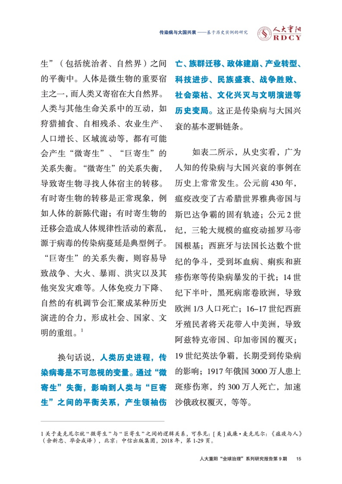 ●人类历史进程,传染病毒是不可忽视的变量。通过“微寄生”失衡,影响到人类与“巨寄生”之间的平衡关系,产生领袖伤亡、族群迁移、政体建崩、产业转型、科技进步、民族盛衰、战争胜败、社会荣枯、文化兴灭与文明演进等历史变局。这正是传染病与大国兴衰的基本逻辑链条。