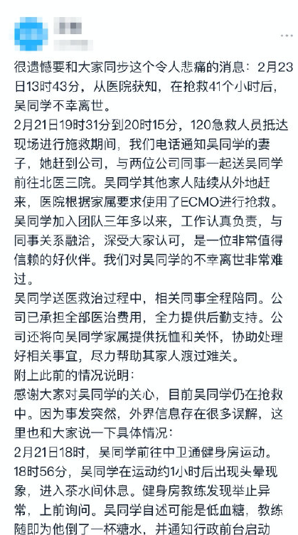“吴同学加入团队三年多以来,工作认真负责,是一位非常值得信赖的好伙伴。公司已承担全部医治费用,全力提供后勤支持。公司还将向吴同学家属提供抚恤和关怀,协助处理好相关事宜,尽力帮助其家人渡过难关。”