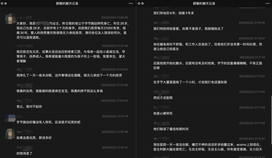 事发后,字节方面通过内网披露了该员工事发前后的经过,并一度表示其仍在抢救中。但网传的聊天记录截图却显示,自称吴同学妻子的网友却早在22日晚9点就宣告了爱人离世的消息;一位称吴同学为师兄的网友也曾在23日凌晨表示,“我们得到的消息是已经没了,需要公司给出妥善安置”。