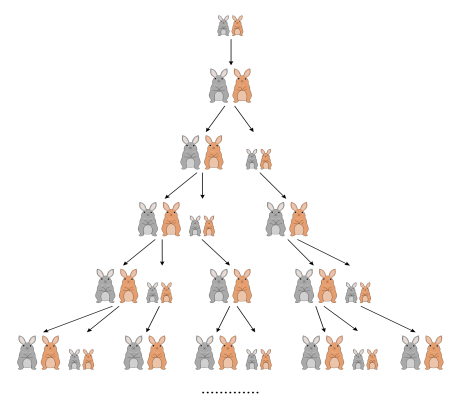 在《Liber Abaci(算书)》一书中,斐波那契提出了一个有趣的问题:有一对成年兔子,每隔一个月就生一对小兔子,而小兔子一个月后也成年了加入生小兔子的行列,如果每对兔子都经历这样的出生、成熟、生育的过程,并且永远不死,问N个月后有多少对兔子?我们不妨用树状图展示一下:
