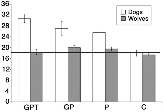 可以发现,和对照(C,啥提示也不给)相比,不管是哪种提示,狗狗的正确率(白)都高于狼(灰) | 图源:Hare B, et al。 Science, 2002。