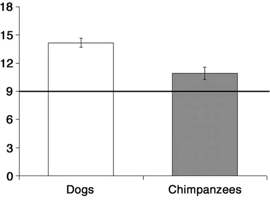 黑猩猩可能是大家心目中是最聪明的动物之一,但它们在这个简单的实验上正确率却并不高;相比之下,小狗的正确率远远高于黑猩猩:即使没有经过训练,它们也能看懂人类的动作指示,准确确认哪个杯子里有吃的。