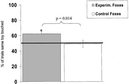 驯化的狐狸(灰色)比野生狐狸(白色)得到了更高、更显著的正确率