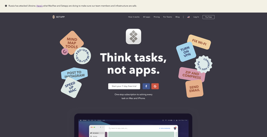 SetApp 网页顶部弹出提醒,对于这次“俄乌”事件,公司 CEO 发声丨官网截图