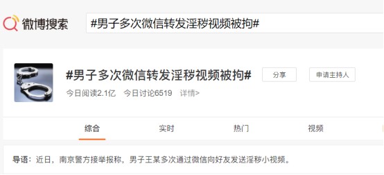微博上,该消息流出后,瞬间引发网友热议,阅读关注数突破2.1亿人次。众多讨论声中,“发小视频也要被抓啊”,“淫秽视频的分级制度是怎样的?”等系列问题成为了大众关心的焦点。