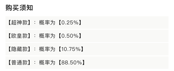 据观察,魔力赏并不公布每个商品的抽取概率和真实数量,只是在商品介绍的底部标注了初始数量配比。部分奖池中,超神款概率为0.25%,欧皇款概率为0.5%,隐藏款概率为7.5%,普通款概率为91.75%,不同的奖池,比例有所差异。