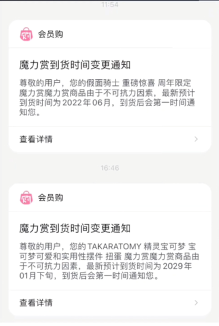 根据一位用户晒出的发货通知显示,其抽中的两款商品均被平台通知延期发货,其中一款商品离谱到7年后才能发货——通知显示,由于不可抗力因素,最新预计到货时间竟然是2029年01月下旬。而在这种情况下,用户也没法退款,因此面临不发货也不退款的情况。