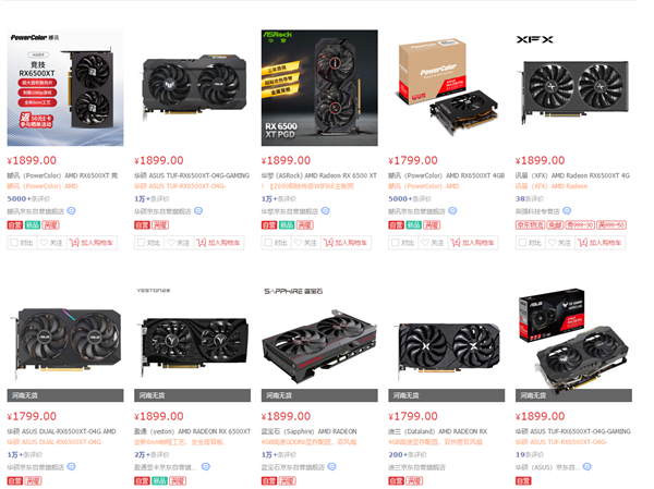 看了下国内电商平台的RX 6500 XT显卡价格,1599元的原价还没有,目前主流价格还在1799到1899元之间,溢价200-300元,不知道什么时候国内也能原价买到。