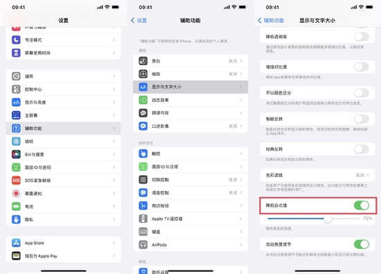 依次点击手机‘设置 > 辅助功能 > 显示与文字大小 > 降低白点值’,屏幕亮度可得到有效降低。