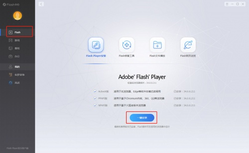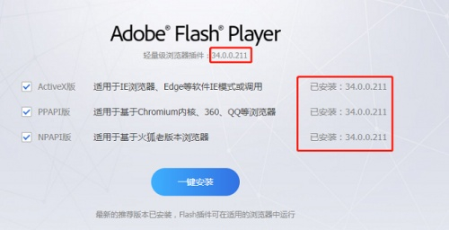 Flash中心设置Flash模块,可以进行Flash Player的升级及安装。通过版本号及安装信息可以判断电脑中各版本Flash Player是否为最新版本,在此页面也可勾选并一键安装需要的Flash Player版本。