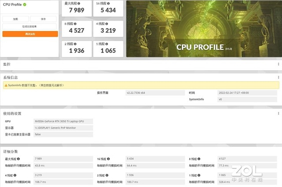 3DMark的CPU PROFILE可以对处理器进行单线程到多线程的全部测试,在这一测试标准下,英特尔12代酷睿i9-12900H处理器单线程得分高达1065,2线程得分1936,4线程得分3219,8线程得分4527,16线程得分5434,最大线程数综合得分7989,其单线程性能发挥出色,对于游戏这类依赖频率的应用来说有着不错的支持。