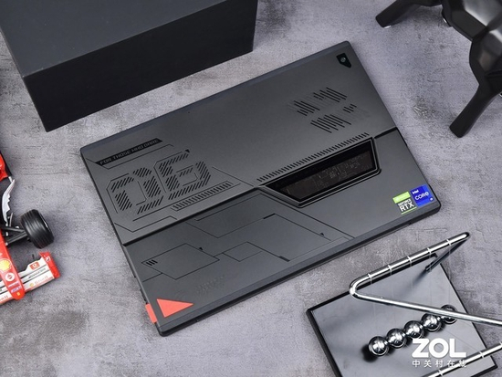 机身背壳以支架转轴为界,分为上下两个部分。上部左侧风扇口设计成“06”样式,右侧则采用了不规则的斜向条状开孔,科技感十足,也很有机甲般的设计风格。