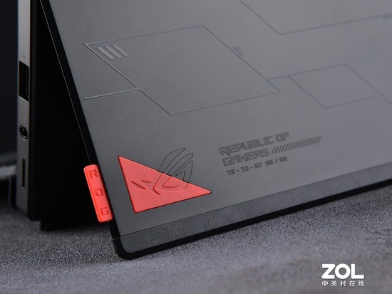 为了方便用户开合机体支架,左下角设计了红色的胶质助力片,并且与整体设计风格很好地融合在一起,再加上ROG logo做点缀,实用性与个性化并存,细节设计让人赞叹。