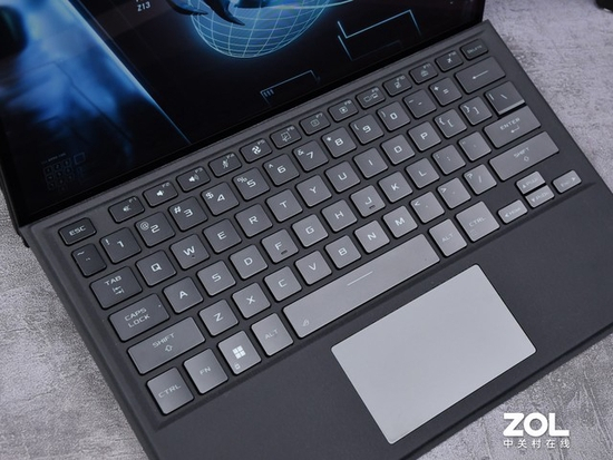 由于硬件都配置于平板部分的机体之内,因此ROG幻X采用了Cover式的磁吸式可插拔键盘,而且这块键盘支持华硕AURA RGB背光,通过内置控制软件可以自定义背光效果,这也是以往2合1电脑所不具备的特性。