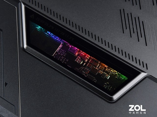 背部最为拉风的地方在于支架右上角的透明区域。开机状态下这里会亮起下图所示的幻彩背光,直接将内部主板上的芯片“点亮”,此时,科技感、艺术感、氛围感融为一体,独树一帜,个性十足。