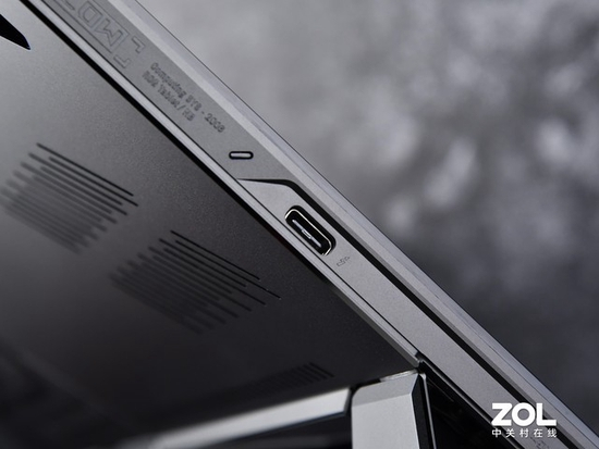 左侧下方接口较为特殊,靠下位置是一枚USB 3.2 Gen 2 TYPE-C接口,融合了DP1.4和PD充电功能。上方是特制的专用显卡扩展坞接口,可支持RTX 3080笔记本电脑GPU扩展,进一步提升图形性能。