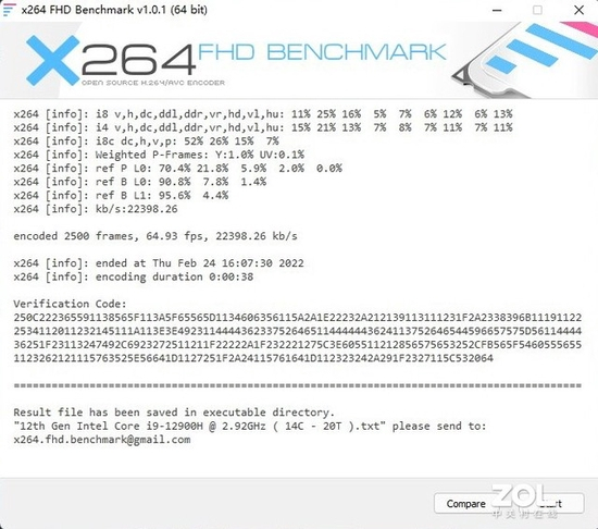 视频编码性能本身就是酷睿平台的强项,12代酷睿i9-12900H处理器虽然采用P-Core+E-Core的异构设计,但也通过英特尔线程调度器实现了异构核心的完美调度。通过x.264 Benchmark测试可见,编码2500 frames用时仅38秒,帧率高达64.93fps,视频编码效率出色。