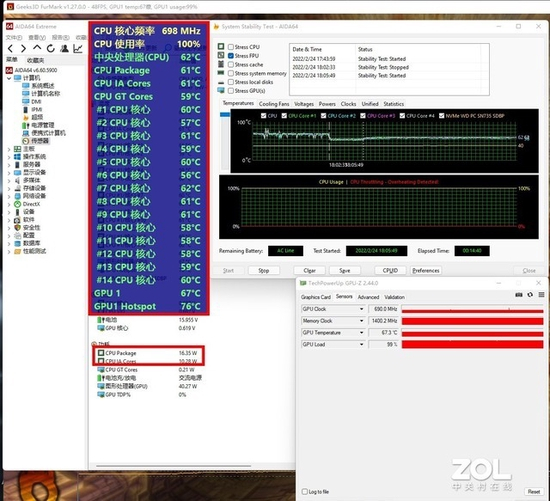 接下来是AIDA 64+Furmark的CPU+GPU双烤机测试。ROG幻X配备的RTX 3050 Ti最大功率为40W,在1920×1200分辨率下,实测GPU功耗释放40.27W,温度为67℃,GPU为满功耗释放;CPU功耗释放16.35W,14个核心温度在56-62℃之间,整体表现对于一款轻薄本而言还是比较不错的,满足重负载生产力应用以及日常游戏应用没有任何问题。