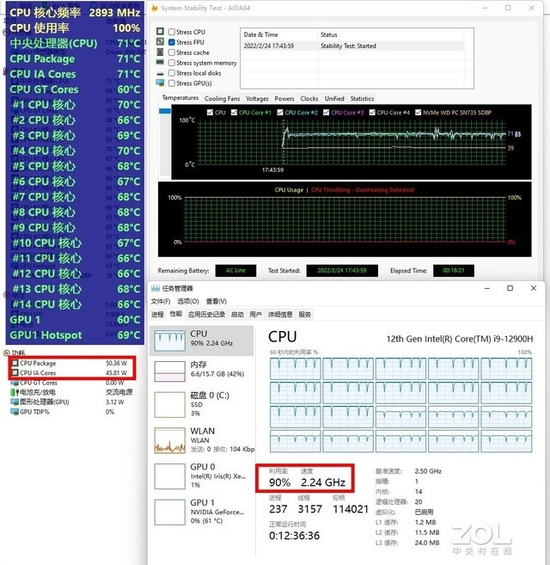首先是AIDA 64 Stress CPU压力单烤机测试下,处理器14个核心温度在66℃-70℃之间,功耗稳定在50.36W,频率稳定在2.24GHz。从TDP释放和核心温度来看,ROG幻X已经控制的足够出色,只是在频率方面略微有些不稳。