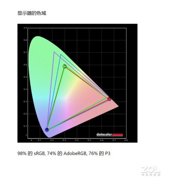 色域容积方面,实测为98% sRGB,74% AdobeRGB以及76% P3,总体表现出色,能够还原出非常丰富的色彩细节。