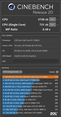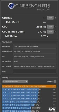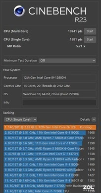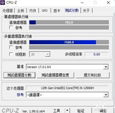 首先是CPU-Z测试,单处理器执行评分783,多处理器执行评分7588.8,相对于11代酷睿i9-11900H而言,单处理器性能提升约10%,多处理器性能提升高达30%左右,而且单核性能释放达到了不错的水准,这是意料之外的事情。