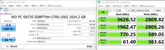 存储方面,这款机器配置了一块1TB容量三星PCIe 3.0固态硬盘,实测其读取速度3626.52MB/s,写入速度2809.82MB/s,4K随机读取速度为61.4MB/s,写入速度则非常优秀,达到了363.62MB/s,从测试来看,这块固态硬盘的性能水准处于PCIe 3.0固态硬盘的顶尖水准,尤其是4K读写速度非常出色。