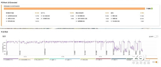 PCMark 10 Extended测试标准中,这款产品在常用基本功能,包含Web浏览、视频会议、应用程序启动等得分高达10148,说明其完成这些基础办公任务没有任何问题;而在生产力项目测试中得分为10015分,表明其拥有高效的电子表格、文档工作性能;数位内容创作方面,其评分达到8213分,说明其能够非常高效地完成图片、视频、图形渲染等工作;游戏性能方面的评分更是高达8184分,处理器和显卡两大强力硬件加持之下,游戏体验极佳。另外其综合得分为7090分,综合性能表现全面,可以说是非常理想的便携型笔记本电脑。