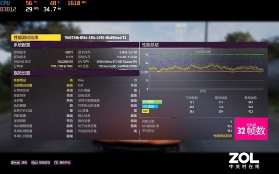 实测1920×1200分辨率下,游戏画面流畅度为32fps,达到了运行游戏的基本帧数要求,如果想要体验更为流畅的游戏,建议大家将画质调整到中等。