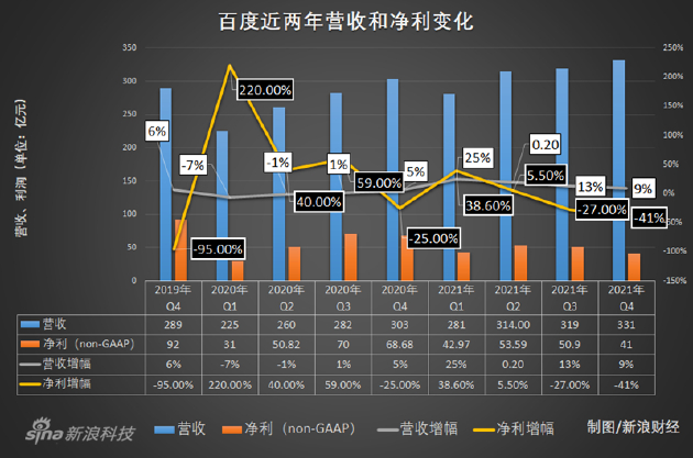百度昨晚发布截至2021年12月31日第四季度及全年未经审计的财务报告。2021年,百度营收1245亿元,同比增长16%。第四季度,百度实现营收331亿元,归属百度的净利润(非美国通用会计准则)达41亿元,同比增速下滑41%。