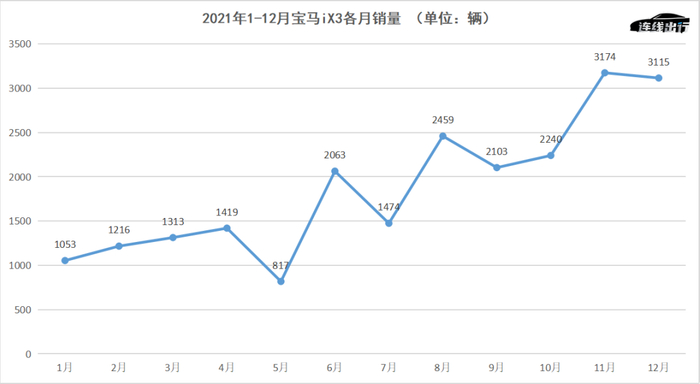 连线出行通过查阅去年1-12月新能源中型SUV销量排名,发现宝马iX3的销量基本在1000-3000辆左右浮动,其销量排名也仅有6月和8月两月进入其排名的前五,其余数月均排在前五之外。