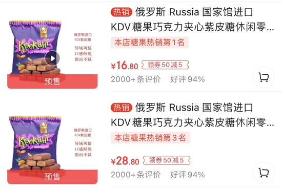 尤其像“紫皮糖”这种俄罗斯热门商品已经被买到显示为“预售”的状态,已售数量达到2.5万件,并且数量仍在继续增加。