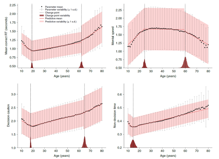 2020年,德国海德堡大学的几位心理学家用这种模型,分析了125名18~62岁被试的数据,发现年纪大的人在非决策过程上花的时间更多,做决策时也更谨慎。但如果要比较真正的信息处理速度,年长和年轻的人就很难分出胜负了,并且和具体的测试内容也有关系。他们还发现,在大多数情况下,不同年龄的人测试结果的差异主要受非决策过程的时间影响。到了2021年,这群科学家的另一项研究总结了25项使用了这种模型的研究,也得到了类似的结果。