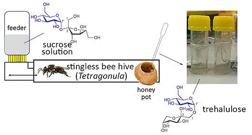 无刺蜂的蜂蜜虽然在产量上远低于传统蜂蜜,但因其醇厚的口味被美食家视为珍馐,市场价格非常昂贵。当然,贵也有贵的道理,以往的研究发现,与传统蜂蜜的糖成分以果糖和葡萄糖等单糖为主不同,无刺蜂蜜主要含一种二糖——海藻酮糖(trehalulose)(图2)。海藻酮糖是一种能够替代蔗糖的高价值天然甜味剂,有较低致龋齿率、较高的抗氧化作用、其小肠水解吸收率只有蔗糖的三分之一,因此有较低血糖指数,可以说有很好的保健效果。还有一点也很重要,天然海藻酮糖除了存在于无刺蜂蜜中,自然界的其他来源还非常罕见。