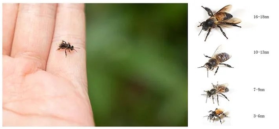 谈到蜜蜂,伙伴们的印象一般是勤劳的昆虫,能酿出甜美的蜂蜜,但也有尾针保护自己。不过,这世上也存在没有蜂针、不蜇人的蜜蜂——膜翅目蜜蜂科麦蜂族(Meliponini)下的蜜蜂都是如此。此类蜜蜂分布于世界热带或亚热带地区(我国云南、海南等地也有分布)。和常见的蜜蜂一样,无刺蜂群也是由分工明确的工蜂、蜂王和雄蜂组成,但无刺蜂个体更小(体长只相当于传统蜜蜂的三分之一)(图1)。这种个头小、没螫针的昆虫看起来实在不起眼,然而它们却有一项独门绝技:酿得一手绝世好蜜。