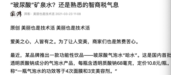 (图片来源:中国新闻周刊截图)来自澎湃新闻上一篇《玻尿酸矿泉水,还是熟悉的智商税气息》文中直接指出“口服透明质酸不可能直接被人体吸收,口服后的大分子透明质酸一样会经过胃肠道的消化分解,先转化成小分子的糖,才能被人体吸收利用。”