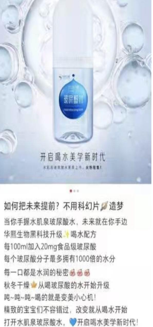 不到2个月,华熙生物就正式推出首款玻尿酸饮用水“水肌泉”,据天猫、京东旗舰店对这款产品的介绍,“想补水,就喝它”——喝玻尿酸饮用水具有肌肤补水功效。