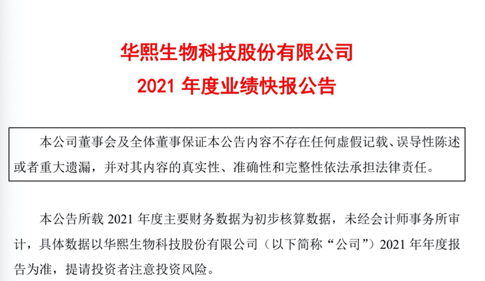2月25日,华熙生物(688363.SH)发布2021年度业绩快报。报告期内,营业收入49.48亿元;公司实现归属于上市公司股东的净利润7.82亿元,同比增长21.13%。