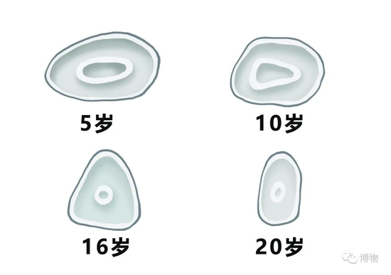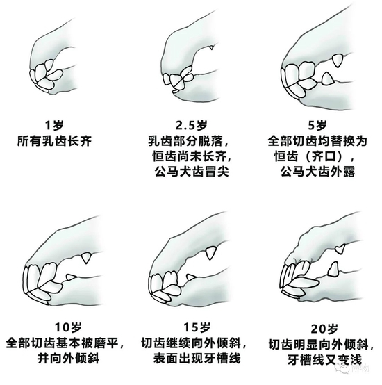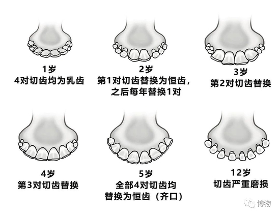 用今天比较科学的语言来说,就是未成年看换没换乳齿,中年看咀嚼面的磨损,老年看牙齿表面的凹槽。