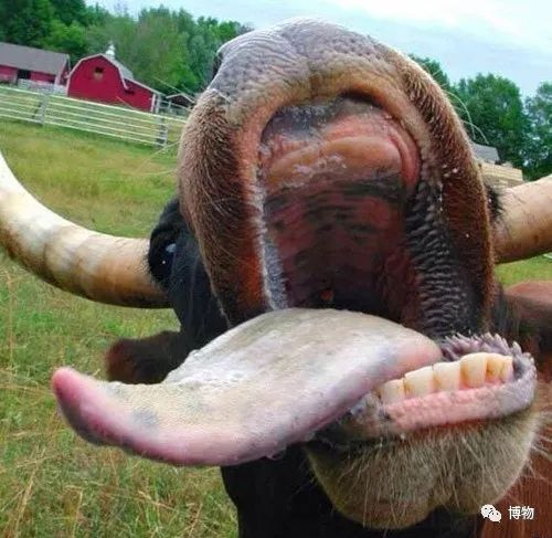 相比马嘴里的三种牙齿俱全,牛羊的32颗牙齿就有些奇葩了——除了上下颌各6对颊齿,它们的上嘴唇里面完全没有门齿、犬齿,只有一块叫“齿垫”的厚实牙龈!