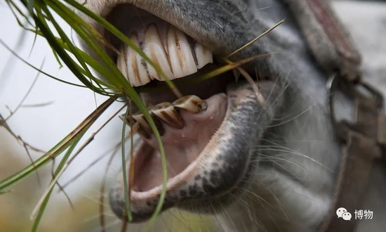 嘴巴正面,则是上下各3对门齿,共12颗,主要用来啃断草叶、草茎。另外4颗呢?是犬齿。别看马这一族吃了几千万年的草,它们嘴里仍然保留了犬齿。