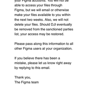3月12日,突然有消息称,大疆内部收到了一封来自设计软件公司Figma的邮件,设计软件公司Figma在邮件中表示:“你好,我们了解到大疆在发布的制裁名单当中被点名,因此Figma无法再为您提供对我们软件的访问权限,我们已经开始冻结您的账户,您将无法再通过Figma访问您的文体,但我们将会在接下来的两周内通过电子邮件或者其他方式将您的文件提供给您。”