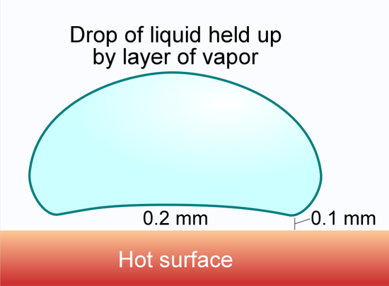 然而这个常识并非在任何情况下都奏效。比如,如果将水滴到150℃的铝板上会发生什么?人们大概会觉得,热源的温度已经高于水的沸点了,水滴接触铝板后应当迅速汽化。然而如果你做一做实验,比如炒菜时,先把平底锅加热,再倒上水,你会发现水滴会悬浮在锅底上滑来滑去,维持一段时间的液态而不是迅速蒸发成水蒸气。这种现象人们很早就发现了,德国医生和神学家约翰·莱顿弗罗斯特(Johann Leidenfrost)在1751年最早描述了这种现象,因此它也被命名为“莱顿弗罗斯特效应”。
