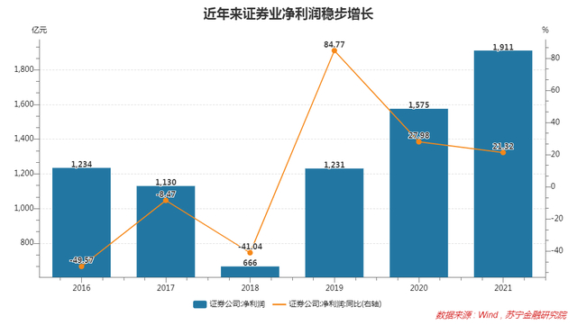 自2018年盈利触底以来,证券行业已连续三年实现利润正增长,且增速还不低。据证券业协会数据,2021年,证券业实现营业收入5024亿元,同比增长12%;净利润1911亿元,同比增长21.32%。