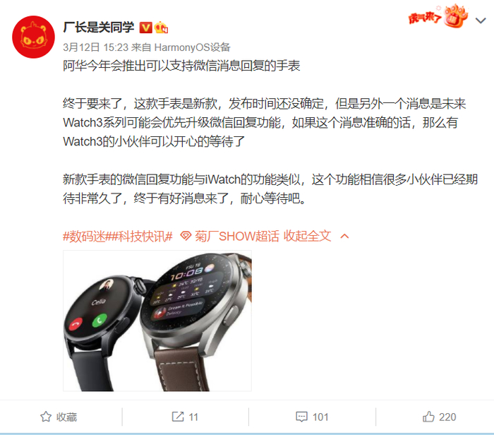 近期,据微博博主 @厂长是关同学 称,华为今年会推出可以支持微信消息回复的智能手表。另外,华为 WATCH 3 系列手表将优先升级微信回复功能。