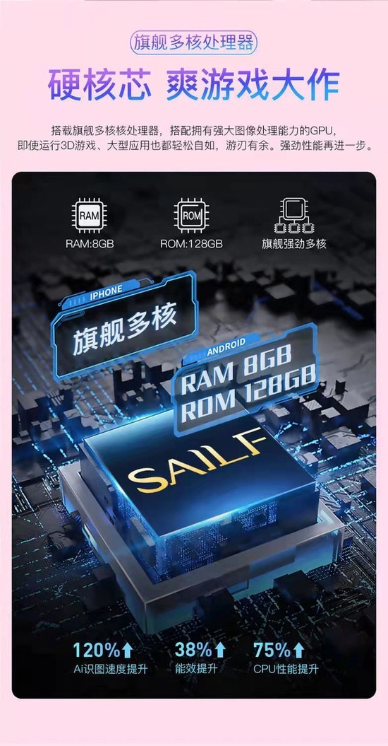 从海报上就可以看出,后置摄像头模组霸气十足,拍照必定不俗,官方的页面着重介绍了照相的部分,其搭载了1600万像素高清超清主摄+120°超广角+2cm的超微距镜头,支持手持降噪夜景拍摄和高清广角变焦拍摄。前置为1300万像素美颜相机,支持人像虚化AI美颜。