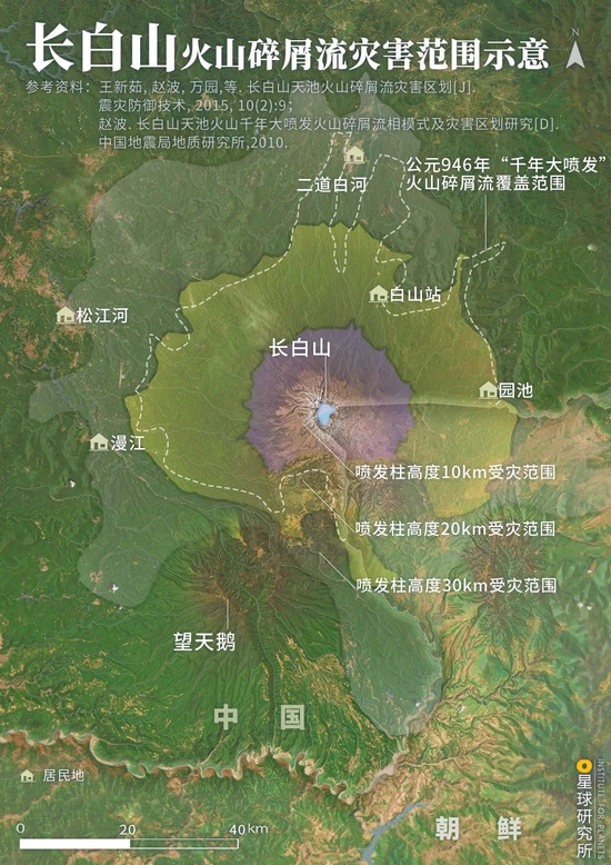 (请横屏观看,长白山946年喷发火山灰影响范围示意,这次喷发也被学界称作“千年大喷发”,制图@陈志浩/星球研究所)