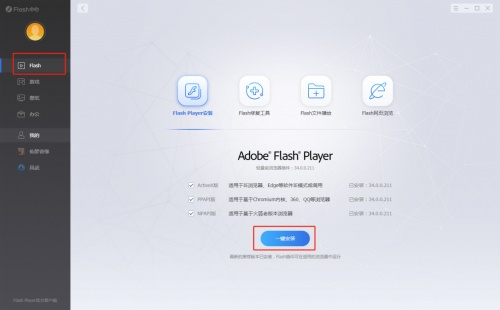 4、安装完成后打开Flash中心,选择Flash一键安装。最新的推荐版本已安装,Flash插件可在适用的浏览器中运行。